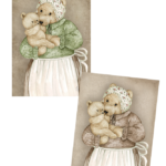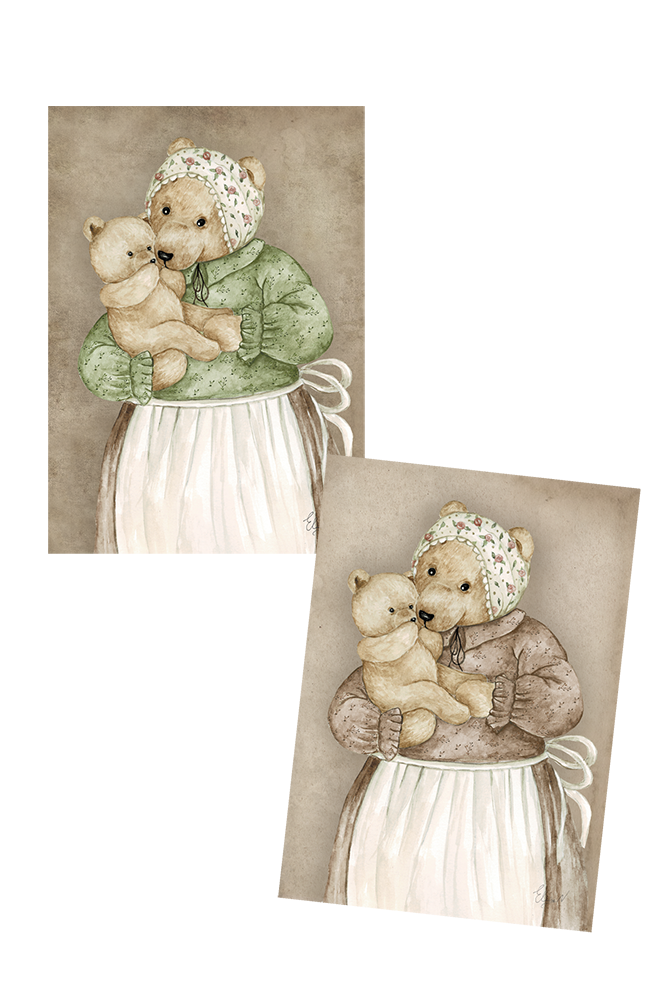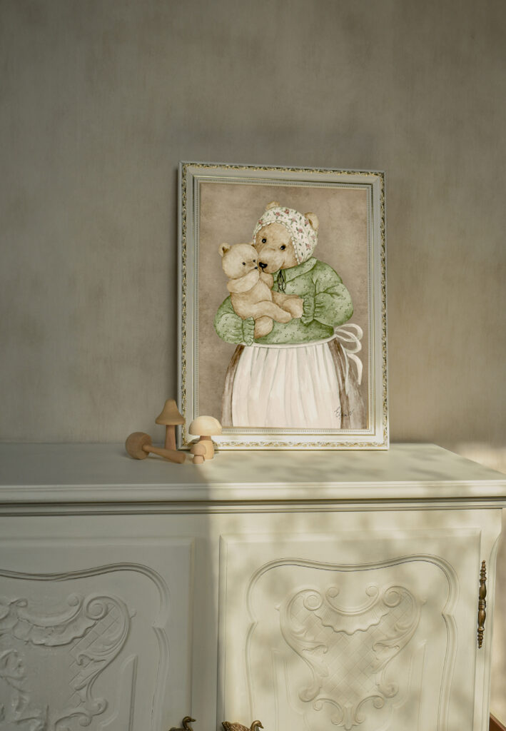 Wydruk autorskiej akwareli projektu Elwiry Narożnik. Przedstawia Misią mamę tulącą swoje dziecko.